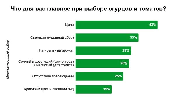При выборе овощей покупателей волнует не только цена и аромат, но и способ выращивания. Так, 38% отметили, что для них принципиально, чтобы томаты и огурцы были выращены без нитратов и химии, а 37% ценят наличие привычной упаковки.