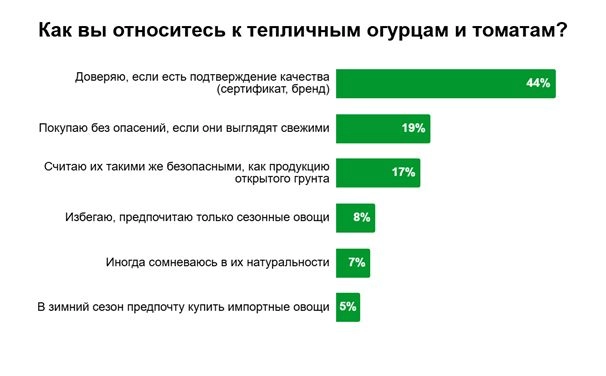 Исследование показывает: российские потребители стали больше доверять тепличным овощам, а мифы о «неестественности» тепличных технологий постепенно уходят в прошлое. При этом критерии выбора по-прежнему включают в себя как цену и свежесть, так и вопросы экологичности и происхождения продукции.