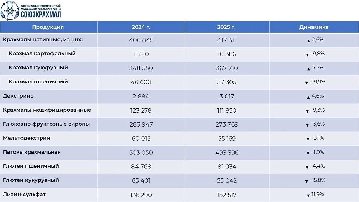 Отчет Ассоциации предприятий глубокой переработки зерна (Союзкрахмал) по производству в России основных видов продукции глубокой переработки зерна. В 2025 году в РФ сохраняется разнонаправленная динамика: на фоне роста производства кукурузного крахмала (+5,5%) и лизин-сульфата (+11,9%), зафиксировано снижение объемов выпуска кукурузного глютена и мальтодекстрина.
